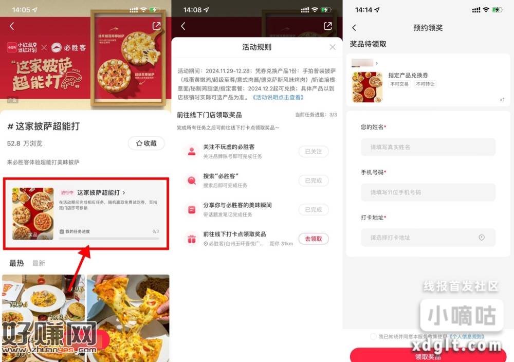 每天10点开始!小红书搜索“这家披萨超能打” 进去完成3个直接领披萨,选择指定店铺兑换即可