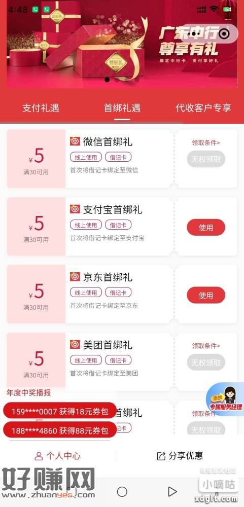 广东中行尊享礼 30减5都去试试 直接到微信卡包
