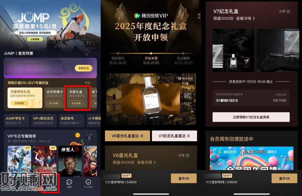 腾讯视频V7和V8会员申领礼盒 底部“会员”->年度礼盒-> 在1月6日11点开哈