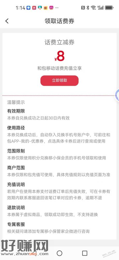 和包-我的-移小宝-立即兑换 兑换后去领取,提示是话费券50-8实际是10-8可抵。