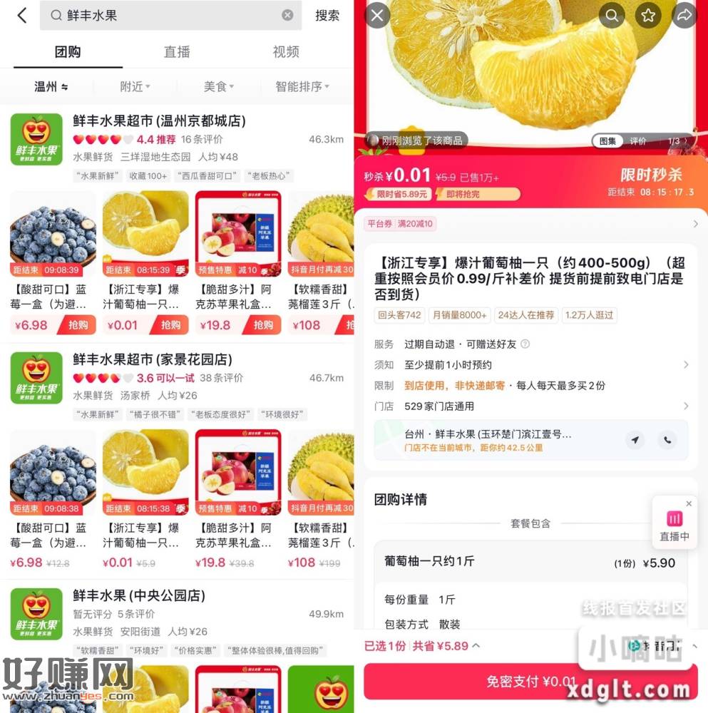 抖音APP顶部“团购”搜索“鲜丰水果” 浙江地区可0.01亓买葡萄柚一只,到店核销即可