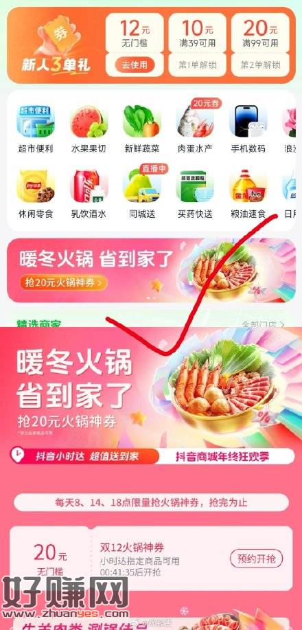 dy小时达,8,14点,18点有20无门槛火锅券