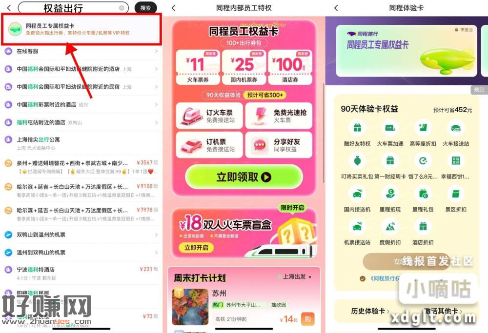 【31-11火车票券】同程旅行挨批批搜索“权益出行”->直接领权益会员,有火车票31-11亓券 和-25飞机票券 部分城市享飞机/火车免费接送站
