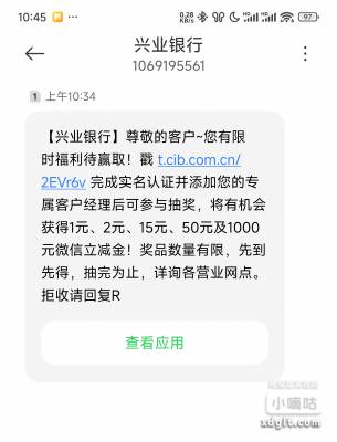 试试【兴业银行】尊敬的客户~您有限时福利待赢取!戳 t.cib.com.cn/2EVr6v 完成实名认证并添加您的专属客户经理后可参与抽奖,将有机会获得1元、2元、15元、50元及1000元微信立减金!奖品数量有限,先到先得,抽完为止,详询各营业网点。拒收请回复R