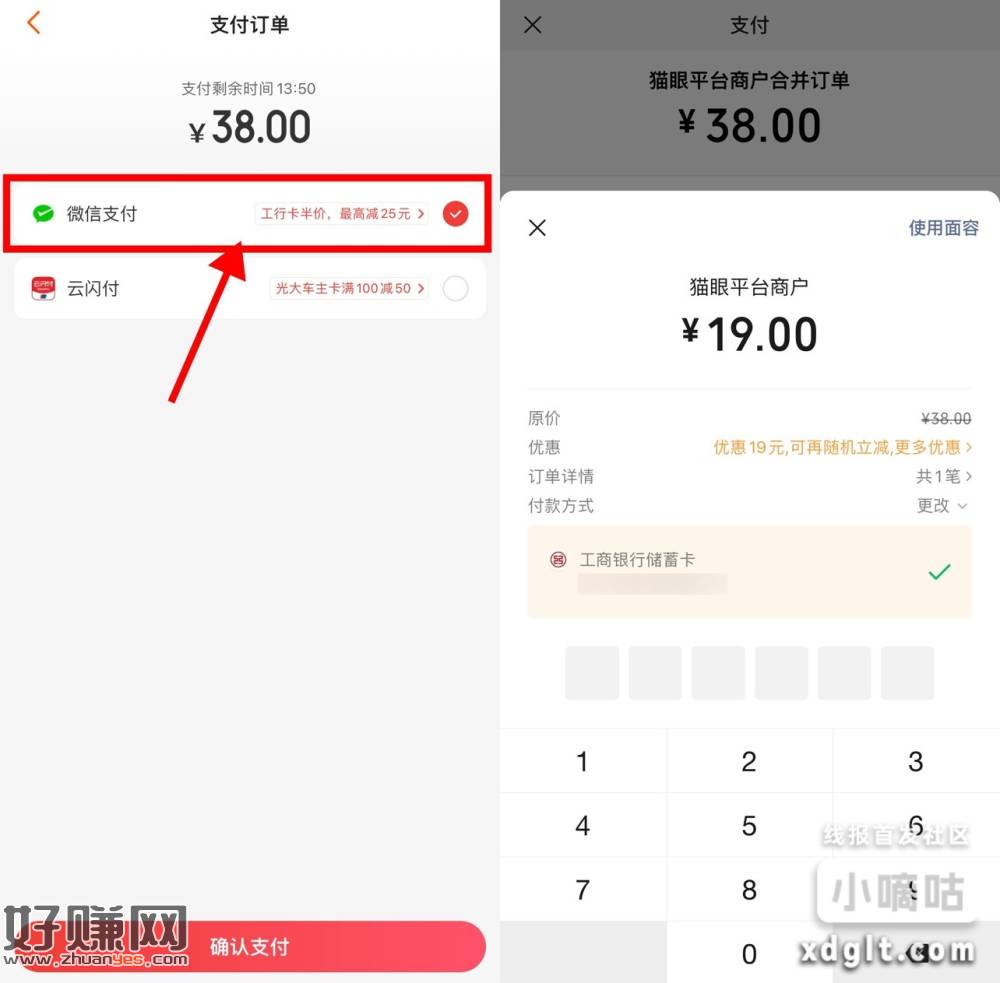 猫眼APP今天买电影票,用工行咔支付限时半价,最高立减25亓