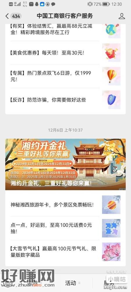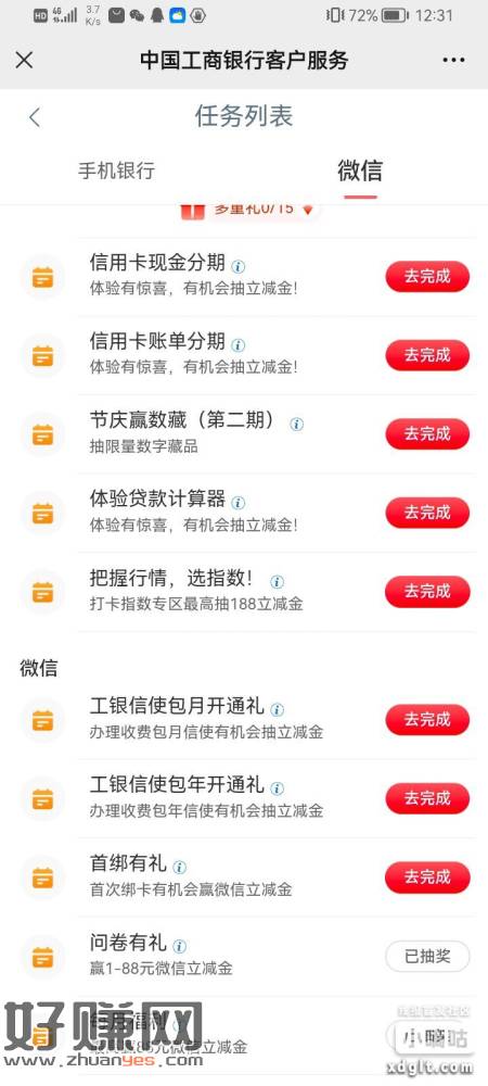 微信公众号中国工商银行客户服务,点中奖活到,任务中心里,有个问卷好像必中,抽中了,但是我的卡是非柜了,用不了,去试试