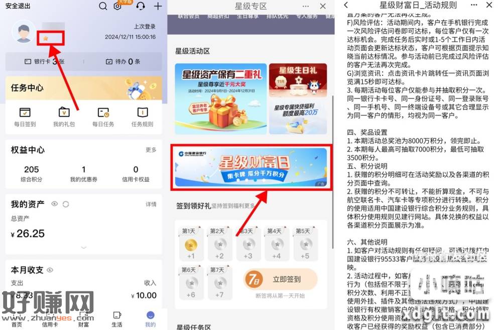 建行APP底部“我的”名字下方点星星进入->轮播图“星级财富日”->完成答题+评测+浏览,抽3500~7000积分,积分在建行生活APP即可抵扣