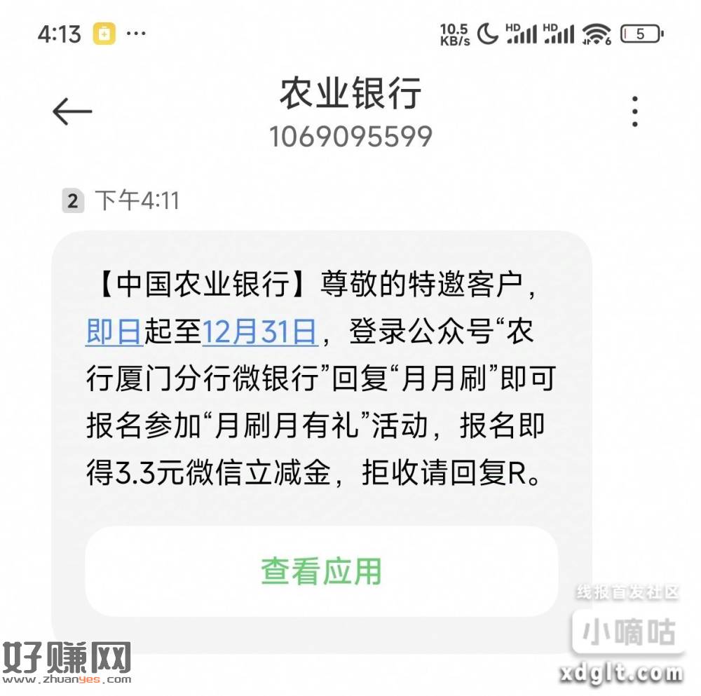 农妇厦门铁公鸡3.3,没玩的玩: 【中国农业银行】尊敬的特邀客户,即日起至12月31日,登录公众号“农行厦门分行微银行”回复“月月刷”即可报名参加“月刷月有礼”活动,报名即得3.3元微信立减金,拒收请回复R。