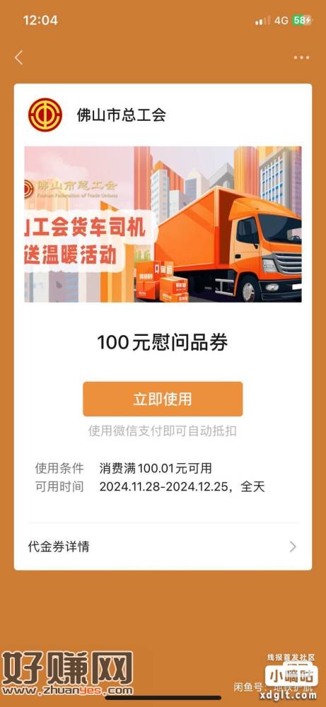 今年进佛山工会货拉拉的可以领100消费券,入口vx粤工惠小程序,点服务,新业业态入会,选佛山城市,下面有佛山工会货车送温暖活动就是了