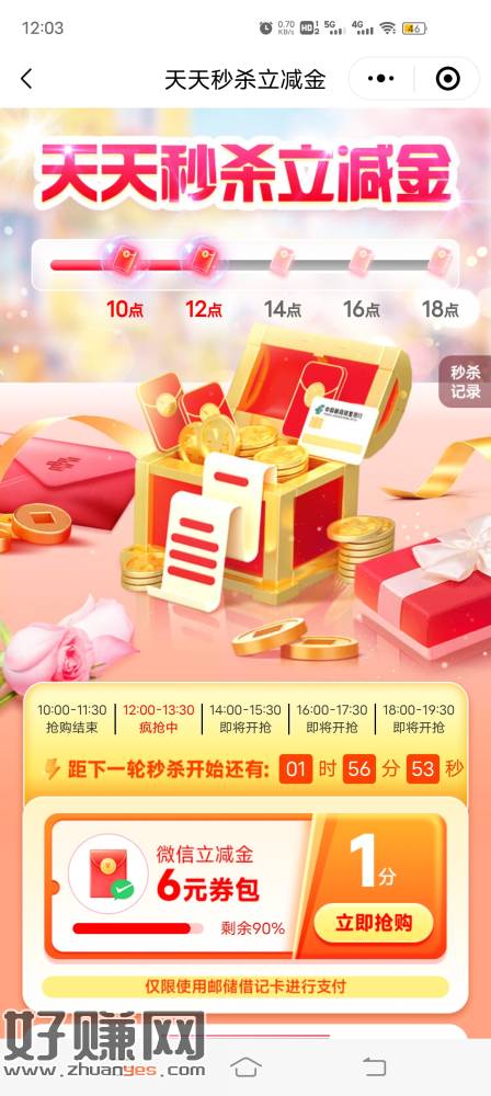 邮储app搜“天天秒杀立减金”,