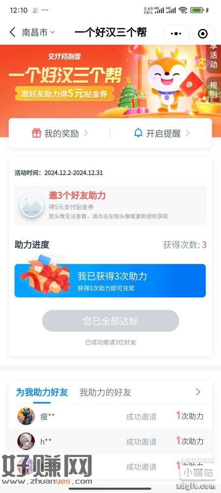 交行活动中心拉到最后,进去小程序拉三个微信好友助力一下,秒到5元贴金券,骚经营可到账。亲测多个同实名小号也能助力一次