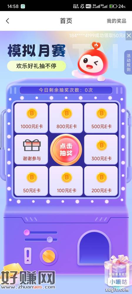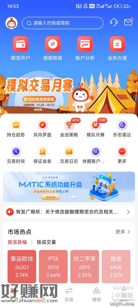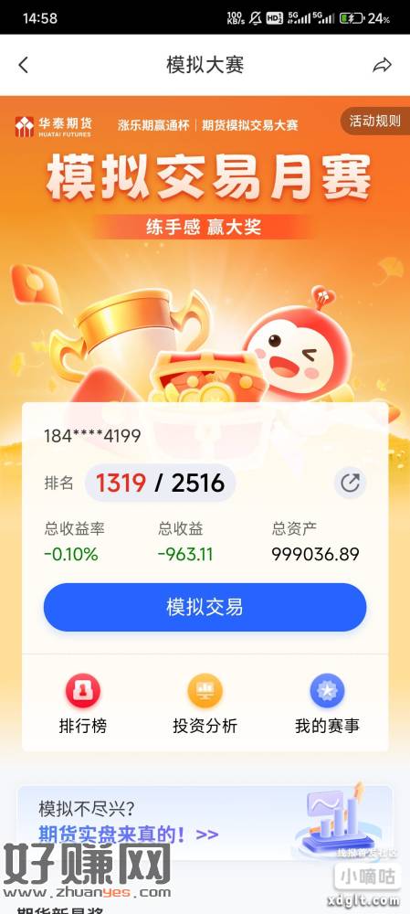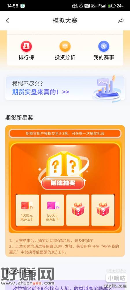 华泰期货没有户的可以去。用涨乐期赢通app新开期货账户,然后报名首页的模拟交易月赛,用模拟金随便买三笔自选,等一两分钟去下面抽奖,暂时保底50ek。
