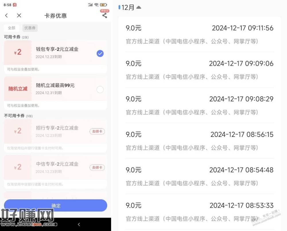 中国电信app,首页充话费,电信号码9元,页面有立减,付款前有显示,可以n次,自测