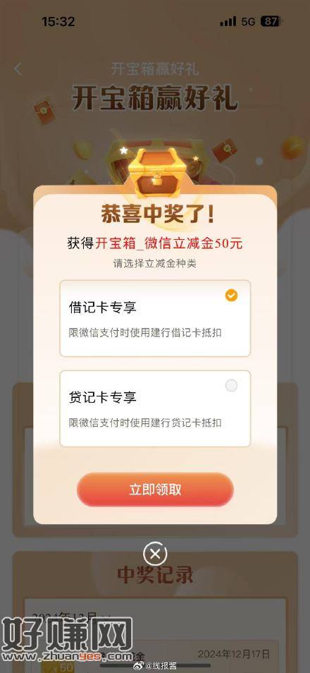 建行开宝箱试试,反馈刚中50