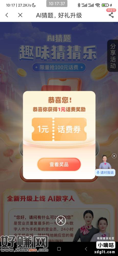 电信ai答题的那个,这个活动我上次中了一百话费,这次只能中小