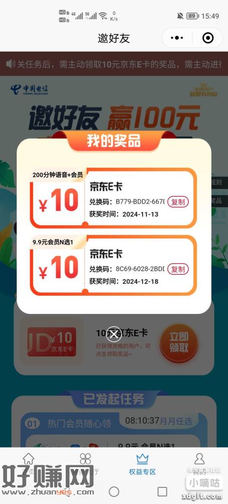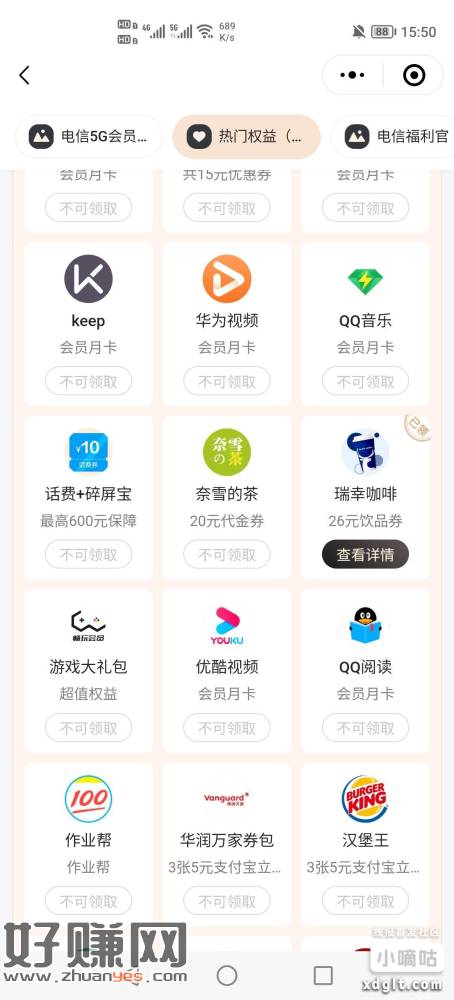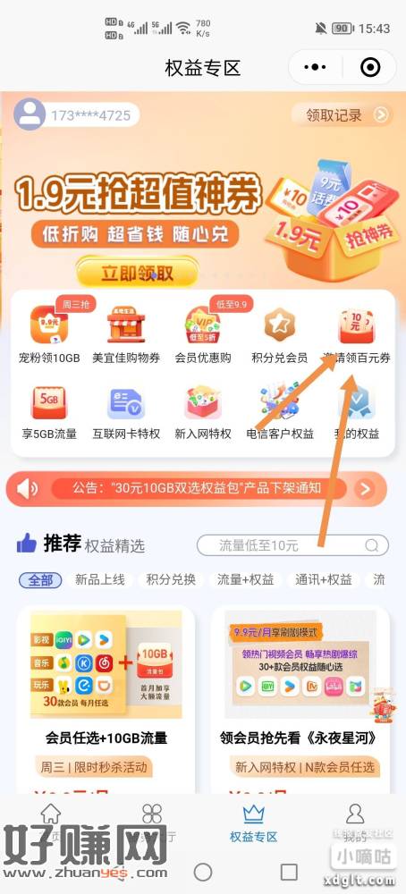 老活动了,只能广东电信号码玩。广东电信小程序,权益专区(入口看图),大小号互拉开通9.9会员得20E卡加9.9权益包两个26瑞幸加商超市立减金10x2。一共50多毛。美滋滋。月底再去退订,下个月又可以继续撸,只有一个广东号码的找人互就行,各的10e卡