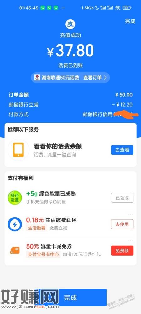 zfb充50话费刚随机立减12.2元可能限湖南邮储,其它地区可以试试有没有其他行的优惠