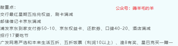 10点开始活动工行-多点:周五周六周日,多点使用工行e支付绑定工行xing/用卡支付,满100-15元(日2960个名额,日1次,共10次,11月29日截止)工行-中粮我买网:周五周六周日,中粮我买网使用工行E支付绑定工行xing/用卡支付,满100-30元)(每日500个名额,日1次,11月30日截止)工行-本来生活:周三、四、五,本来生活购物使用工行e支付,满100-30,(每日500个名额,日1次,11月30日截止)工行-途牛:每日途牛网App选择工行e支付支付,满300-50元/500-100元(每日6500个名额,仅1次,7月15日截止)工行-携程:每日携程APP购买国内酒店或国内门票用工行xing/用卡支付,满100-40元(每日300个名额,限1次,7月17日截止)农行-天天抢券:每日,农业银行xing/用卡微信小程序一慧U惠-精选推荐/农业银行APP-xing/用卡一精品秒杀,7折起抢购指定商户代金券,日限1次、各限2张、活动期间共限6张(7月31日截止)建行-饿了么:每日,饿了么使用支付宝选择建行xing/用卡支付,满20-6元(日2.3w名额,日1次,共4次,8月31日截止)建行-盒马鲜生:每日,盒马鲜生门店或APP使用支付宝选择建行xing/用卡支付,满220-20元(日2k名额,日1次,共4次,12月31日截止)中行-携程:周五周六10点起,携程购买酒店满300立减10-300元,门票满100立减5-300元,周边游满200立减50-300元(月各1次,11月27日截止)邮储-京东(借):周五,京东购物绑卡支付,满299-20元(每日6500个名额,21年2月12日截止)光大-超值星期五:周五,光大手机银行-生活-超值星期五,可抽各种优惠券,可在APP的生活版块使用(12月31日截止)光大-天猫超市:每日,阳光惠生活APP-首页-本地活动,可10元买30元天猫超市消费权益(日1050个名额,月1次,12月31日截止)光大-视听会员:光大借记卡快捷消费3笔满299元,可每日10点起手机银行APP-生活-超值权益-免费领好礼,抢视频或音乐月度会员(每日各200个,每种限1次,8月31日截止)光大-喜马拉雅:7月3日-8月23日使用光大借记卡快捷消费单笔满299元,可每日10点起手机银行APP-生活-超值权益-免费领好礼,抢喜马拉雅月度会员(每日400名额,仅1次)浦发(借)-权益卡:周五10点起,浦发借记卡1.99元购京东15元权益卡,包括一张2000-4元xing/用卡还款券及50-10元京东支付券(每日3k名额,仅1次,7月31日截止)地址:本公众号回复“浦发京东”即可获取浦发(借)-还款券:周五10点起,使用浦发62借记卡通过云闪付APP完成一笔1k+xing/用卡还款,可获得10元还款券(每周11500个名额,月1次,21年2月19日截止)浦发-酒店银行:7月17日10点起,浦发银行酒店银行-暑期乐悠游,购买酒店住宿满300-150元,满500-250元,满800-400元(限2次,3k名额)浦发银行(借)-口碑:周五,口碑APP-我的-银行卡特惠-浦发借记卡活动-适用商品可领取40-20/20-10元优惠券(3529/1500份)(月1次,10月31日截止)浦发-饿了么:浦大喜奔APP-小浦惠花-饿了么,随机立减1-30元;浦发-半价权益:周一至周五,浦大喜奔APP-小浦惠花,臻选会员享优质权益半价购中信-9分享兑:每月任意交易9天,可得一个9分权益,可于达标T+4日后每日10点起在动卡空间APP-9分享兑,抢兑权益(每月20w礼品,7月31日截止)华夏-9元洗车(借):云闪付APP-首页上方菜单栏“更多”-数字礼券-华夏银行9元洗车,华夏62借记卡支付可9元购28元洗车券(248份,每月每卡1次,7月31日截止)北京银行-美团5折:美团系(美团点评外卖买菜)通过绑卡支付,享5折优惠,封顶10元(限量,3次,7月31日截止)北京银行-京东:周四周五,京东购买实物绑定北京银行xing/用卡支付,满199-30元(每日400名额,月1次,8月31日截止)浙商银行-话费:云闪付APP充值话费选择浙商62卡支付,满50元随机立减5-50元(每日280个名额,月2次,12月31日截止)平安-饿了么:每日饿了么-我的-我的钱包-银行福利指定商户,使用支付宝选择平安xing/用卡支付,满30-18元(每日4k个名额)平安-屈臣氏:指定屈臣氏门店使用银联二维码绑定平安62xing/用卡或者储蓄卡支付,享88折优惠,上限25元(月2次,8月31日截止)联通-美团红包:联通手机营业厅-首页-今日主推,可10元抢30元美团外卖红包