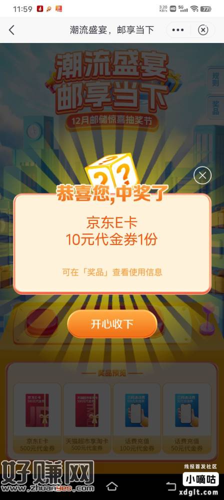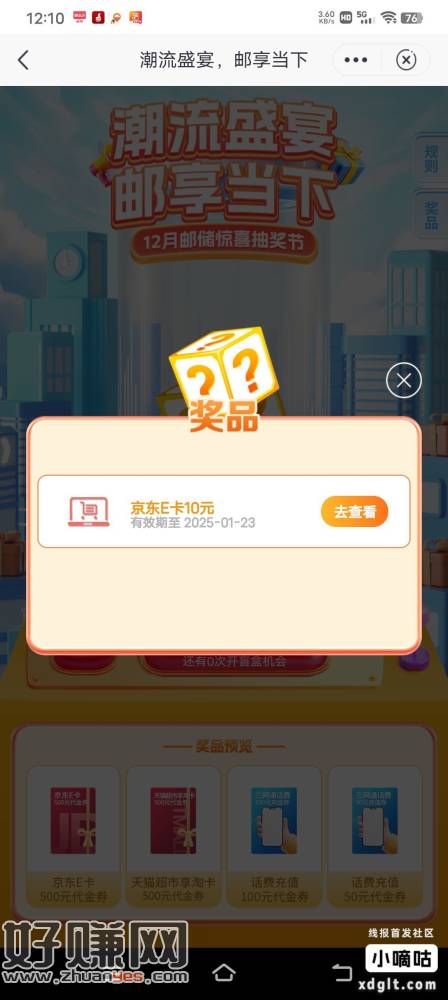 【在赢端】尊敬的客户,您参加的上海邮储“潮流盛宴,邮享当下”营销活动,已成功获得10元京东E卡,请前往
