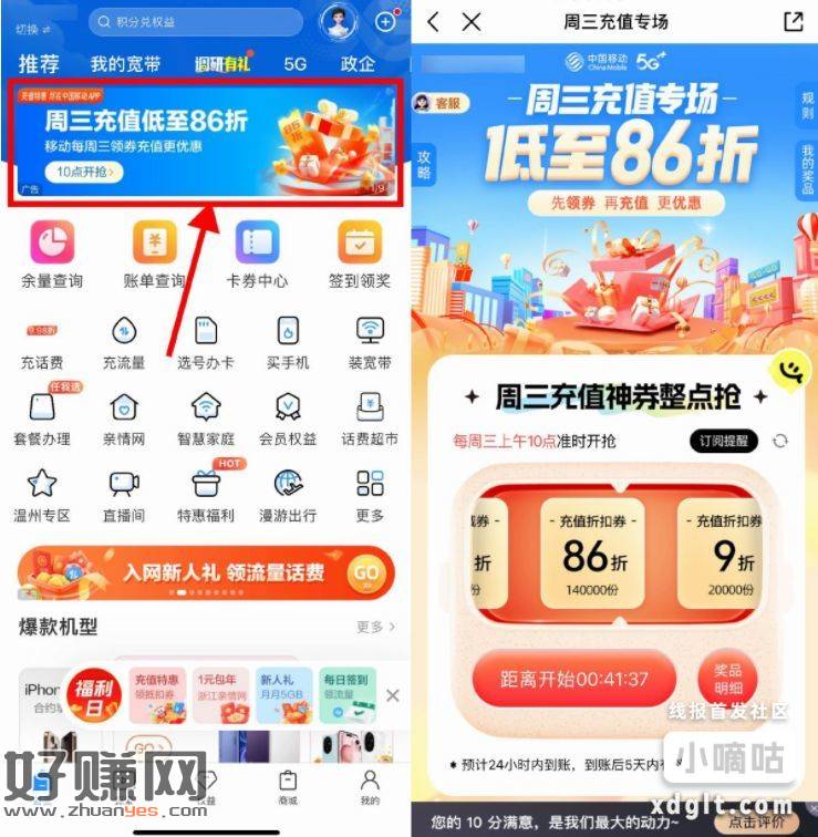 移动APP搜索“周三充值”->每周三10点抽86折话费券,共限量14万份