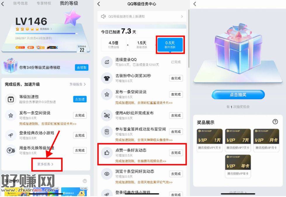 QQ点自己等级进入->点更多进入->顶部“额外活跃”找到点赞动态的,完成后抽1~365天腾讯视频会员