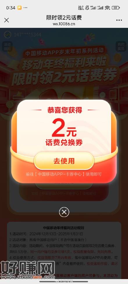 移动这个两元话费反馈有