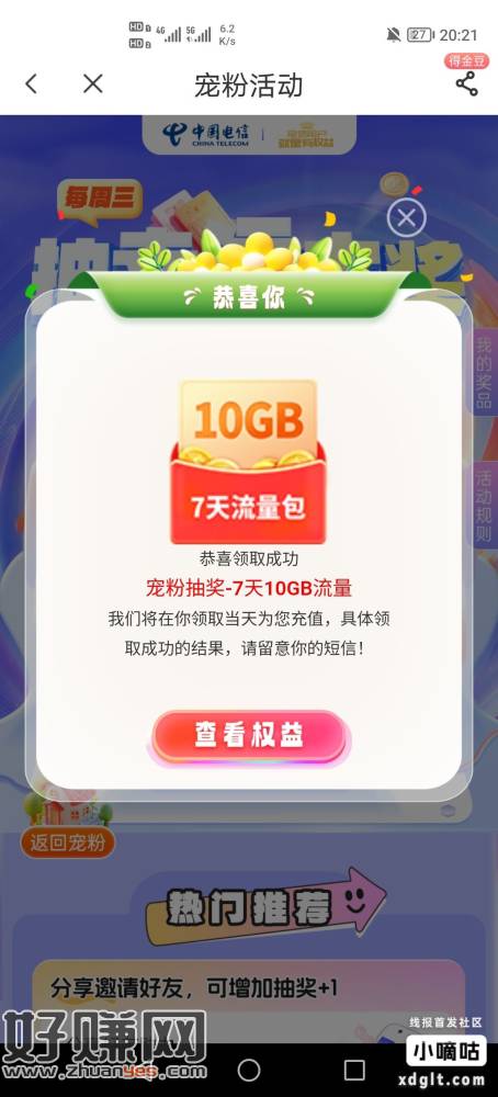 广东电信周三超级宠粉日,电信首页搜索框发送宠粉。基本必中10