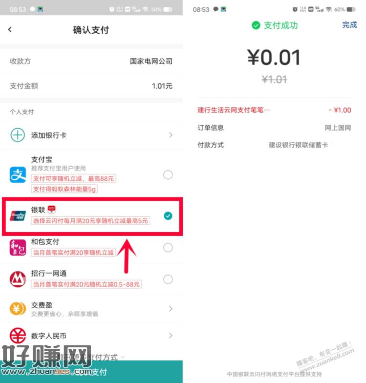 新一期,打开“中国移动”APP自定义金额充1.01元话费(部分地区最低需要10元起充)、或者打开“网上国网”APP充1.01元电费,支付方式选择【银联】进去再选择【建行生活】会立减1元,等于0.01元充值1.01元话费或者电费,可以反复充4次立减4次(储蓄卡可以充4次减4次、有xing/用卡的还可以再充4次再减4次),如果支付的时候没有显示立减1元就不要付 易捷充油卡也可用