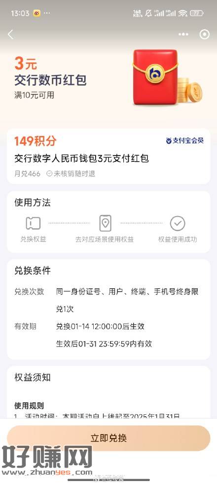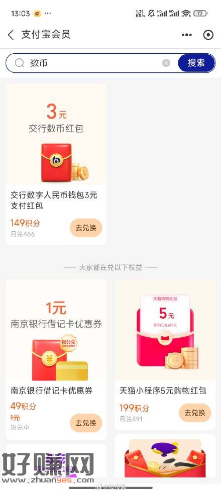支付宝积分搜数币,有149兑换交行数币10-3