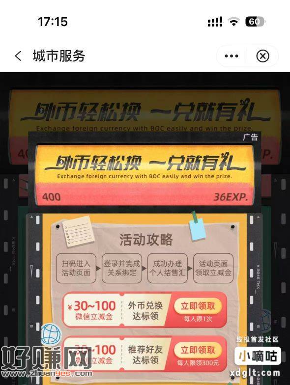 中行APP,生活,城市服务,中间,外币轻松换,结售汇购买500美元,马上卖出,就达到交易额1000美元,折损15人民币,润15,