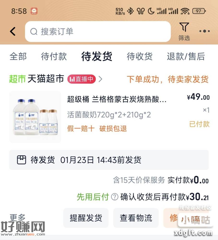 发货了,去看看: 仅限15号到16号这两天在南京银行兑换的实物,部分人应该都发货了,刚顺丰给我通知快递发出,我一看显示是牛奶,我天猫超市买的牛奶还没发货,就是它了南京银行发的