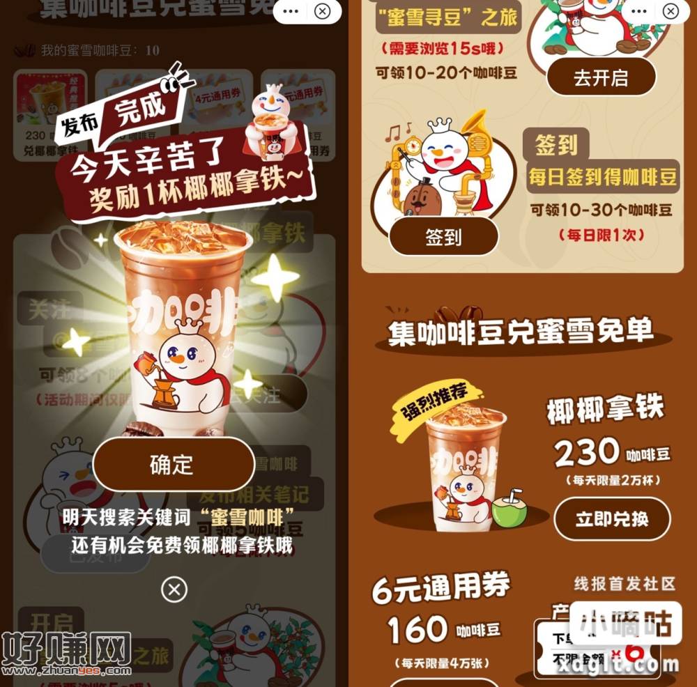 记得每天去玩!小红书搜索“蜜雪咖啡”->每天发帖抽2万名蜜雪咖啡免单券,下拉攒咖啡豆也能兑换免单券
