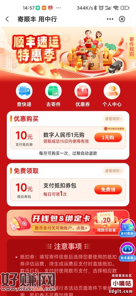 【中行APP顺丰1购10】中行APP,生活,往下拉(寄快递用的不是现金)