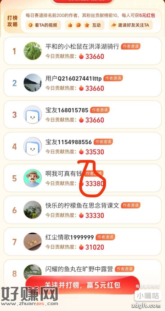 5的就简单了,各分赛道前200的帮他他打榜,自己在他的榜前10就行了,这个不用扫码也行。不要被偷家就行了。找100往后的粉丝少的前十热度低的就行了,简单