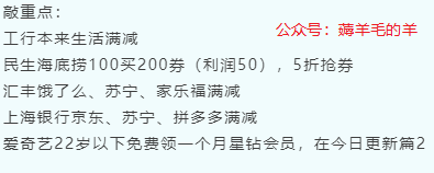 0点开始活动农行-苏宁分期:每日,苏宁易购购买实物,农行xing/用卡分期支付、满3000-100元(月1000名额)、满5000-120元(月600名额)(月1次,三选一,7月31日截止)交行-饿了么:每日,饿了么使用支付宝绑卡支付,满20-5元(9782名额,月1次,7月31日截止)交行-去哪儿:每日,去哪儿旅行APP使用交行xing/用卡支付订购机票产品,满500元随机立减9.99-99.99元(共21w个名额,共2次,9月30日截止)浦发(借)-微信支付:每日,在指定商户通过微信绑卡支付,可享满减优惠孩子王门店/APP/小程序,满300减50元鲜丰水果门店,满50减20元苏果超市门店,满50减10元好孩子云店/星站云店/mothercare小程序,满100减30元食行生鲜APP/小程序,满100减30元(周各限1次,每日名额有限(7月31日截止)浦发-携程门票:每日,携程APP-首页-更多-合作卡-浦发xing/用卡,购买景点门票使用浦发xing/用卡支付,满100-20元(每日1k名额,限2次,7月31日截止)中信-精彩365:每日,动卡空间APP-友鱼-精彩365,可7折起抢购:盒马鲜生、奈雪、周黑鸭、美团外卖、必胜客、滴滴、达美乐、肯德基、百果园等代金券(8月31日截止)中信(借)-麦当劳:每日,麦当劳指定门店使用银联二维码选择中信借记卡支付,满20-10元(每日5k个名额,7月31日截止)平安-京东:每日,京东购买美妆品类使用平安xing/用卡支付,满100-18元(日1次,月2次,8月31日截止)银联云闪付-小米有品:每日,小米有品APP购物使用云闪付APP支付,满100-15元(共6W名额,月1次,7月31日截止)墨迹天气-微信“墨迹天气”小程序-点击领雪碧,每天都可以免费领取中杯汽水电子兑换码一张,可至麦当劳门店扫码兑换使用单日单用户限使用一张,(9月4日截止)京东-PLUS会员支付券:每日抢:36元小金库消费券包(18元支付券+18元还款券),活动入口:本公众号回复“京东支付”即可获取(月1次,8月31日截止) 6点开始活动银联云闪付-一二306:一二306APP购票,云闪付绑卡支付,享最高20元随机立减(2k名额,日1次,8月28日截止)浙商银行-一二306:一二306APP购票选银联选择浙商62卡支付,满50随机立减5-50元优惠(月2次,12月31日截止) 7点开始活动工行-支付宝:每日,支付宝APP搜“工行送红包”领取话费/缴费红包,满200-10加油红包(名额有限,月各限1次,7月31日截止)浦发(借)-曹操出行:每日,曹操出行APP充值/支付订单使用微信绑卡支付,可享随机立减5-99元,(日限1次,757名额,7月31日截止)平安-全家:每日,全家指定门店使用微信绑卡支付,满1元享88折,10元封顶(周1次,7月31日截止) 7点半开始活动建行-饿了么:每日,建设银行APP-悦享生活-饿了么,下单满20-10元(共4次,共72w名额) 8点开始活动建行-永辉:每日,永辉生活APP或永辉超市使用支付宝选择建行龙卡xing/用卡支付,满60-10元(每日6600个名额,日1次,共4次,11月30日截止)民生(借)-京东到家:每日,京东到家APP使用云闪付绑卡支付,满50-15元(500名额,日1次,3次,8月10日截止)平安-京东到家:每日,京东到家使用微信支付绑平安xing/用卡支付88折,上限20元(8月31日截止) 9点开始活动建行-百大易购:每周六周日,百大易购APP购物使用云闪付绑卡支付,满50-25元,(月限1次,名额有限,10月31日截止)交行-口碑:每日口碑APP-我的-银行卡特惠-交行20-10元,指定商品页面下方可领20-10元优惠券(活动期间限3次,5000名额,7月31日截止)邮储-百大易购:周六周日,百大易购APP购物使用银联支付选择邮储62xing/用卡支付,满50-20元(月1次,7月31日截止)北京银行-苏宁易购:周六周日,苏宁易购使用北京银行xing/用卡支付,满199-30元(月1次,8月31日截止) 9点半开始活动工行-喜茶:每周五周六周日喜茶门店/支付宝小程序使用支付宝消费,满50-15元(日1次月4次,1W名额,8月30日截止) 10点开始活动工行-本来生活:周日,本来生活用工行62xing/用卡支付,满100-50元(日1500个名额,日各1次,7月31日截止)工行-多点:每周五周六周日,多点使用工行e支付绑定工行xing/用卡支付,满100-15元(日2960个名额,日1次,共10次,11月29日截止)工行-中粮我买网:周五周六周日,中粮我买网使用工行E支付绑定工行xing/用卡支付,满100-30元)(每日500个名额,日1次,11月30日截止)农行-天天抢券:每日,农业银行xing/用卡微信小程序一慧U惠-精选推荐/农业银行APP-xing/用卡一精品秒杀,7折起抢购指定商户代金券,日限1次、各限2张、活动期间共限6张(7月31日截止)建行-饿了么:每日,饿了么使用支付宝选择建行xing/用卡支付,满20-6元(日2.3w名额,日1次,共4次,8月31日截止)建行-盒马鲜生:每日,盒马鲜生门店或APP使用支付宝选择建行xing/用卡支付,满220-20元(日2k名额,日1次,共4次,12月31日截止)邮储(借)-本来生活:周六周日,本来生活APP购物使用云闪付选择邮储借记卡支付,满60-30元(每日1k个名额,共5次,2021年2月28日截止)光大-天猫超市:每日,阳光惠生活APP-首页-本地活动,可10元买30元天猫超市消费权益(日1050个名额,月1次,12月31日截止)光大-视听会员:光大借记卡快捷消费3笔满299元,可每日10点起手机银行APP-生活-超值权益-免费领好礼,抢视频或音乐月度会员(每日各200个,每种限1次,8月31日截止)光大-喜马拉雅:7月3日-8月23日使用光大借记卡快捷消费单笔满299元,可每日10点起手机银行APP-生活-超值权益-免费领好礼,抢喜马拉雅月度会员(每日400名额,仅1次)浦发(借)-口碑:每日,口碑APP-我的-银行卡特惠-浦发借记卡活动-适用商品可领取20-10元优惠券(1500份)(月1次,10月31日截止)浦发-饿了么:浦大喜奔APP-小浦惠花-饿了么,随机立减1-30元;中信-9分享兑:每月任意交易9天,可得一个9分权益