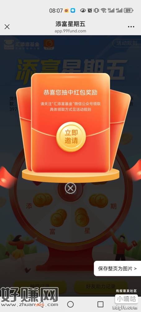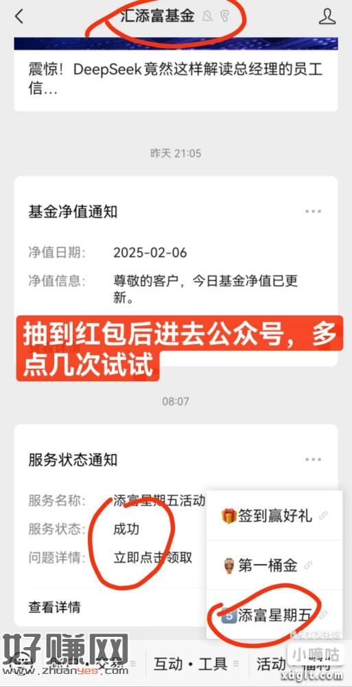 《汇添富基金》右下角,活动福利,添富星期五,中了,多点几次推送的公众号,我领了3个包