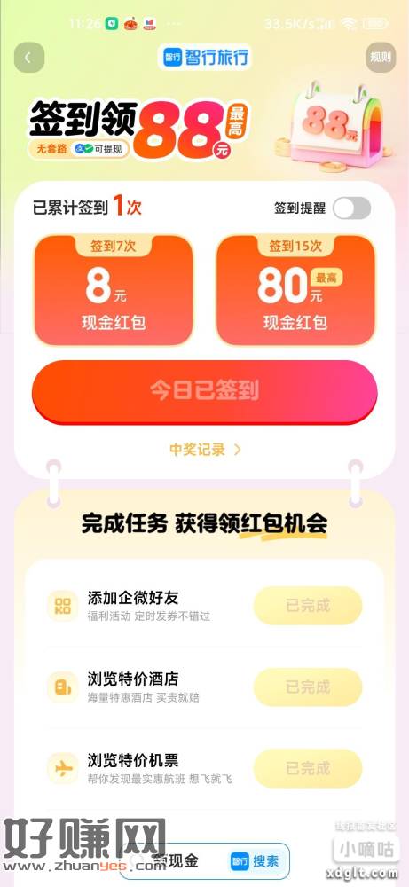 智行旅行app搜领现金,进去活动最低0.8秒提签到7天得8签到15天最高得88