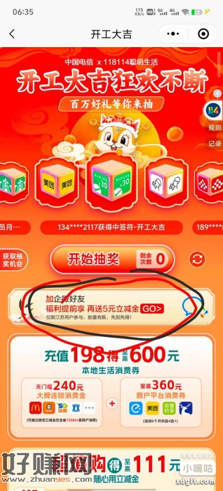 118114聪明生活小程序进去,顶上第一个开工大吉进去,进去以后中间有个加好友。加完好友之后,领那个五的话费券,然后一周后扫自己微信码付款五就行。 是5-5的,手机号,江苏的就行。,移通,联通,电信都行。 会J..m的可以去J..m。但是一个微信只能一次。相当于一个微信5块。他信可以接。