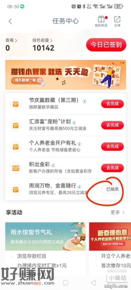 工行,任务中心,雨润万物,浏览抽奖5-2。