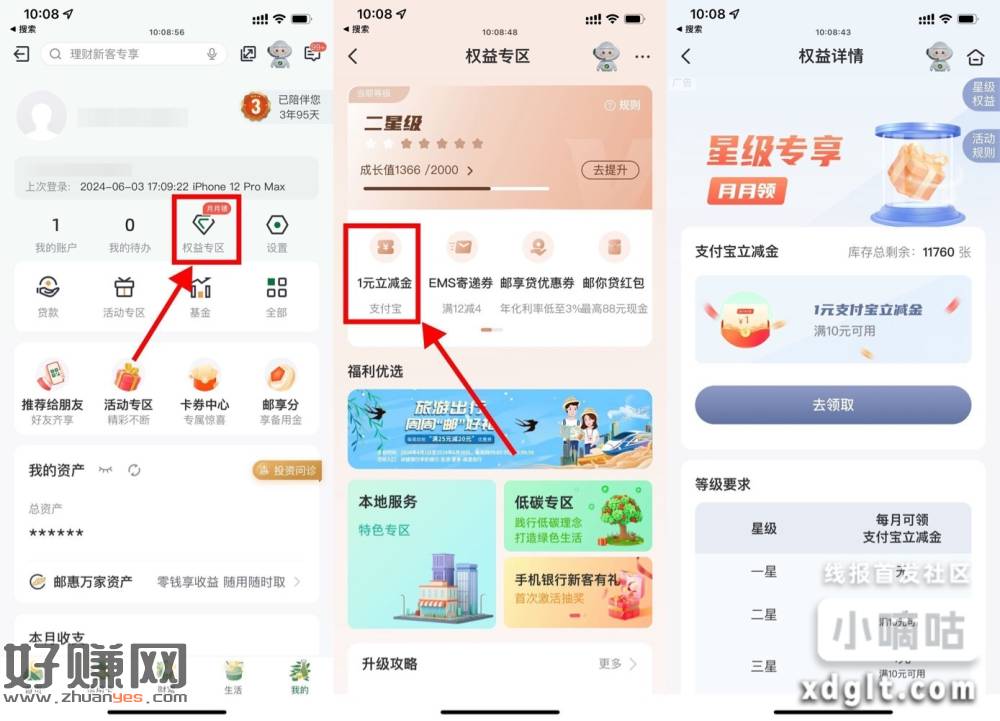 【邮储每月权益星级领取1~6元】限二星以上参与!邮储银行APP->我的->权益专区->立减金->直接领取1~6元立减金,等级越高领的越多