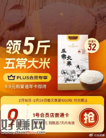 9.9,1号会员店普通卡赠品5斤五常大米 但是需要