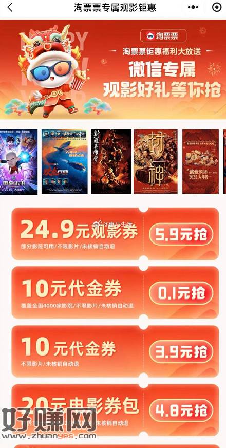 【淘票票0.1亓买10亓电影票券】微信打开活动->直接0.1买10电影票劵/5.9买24.9电影票代金券,所有电影都是通用的!