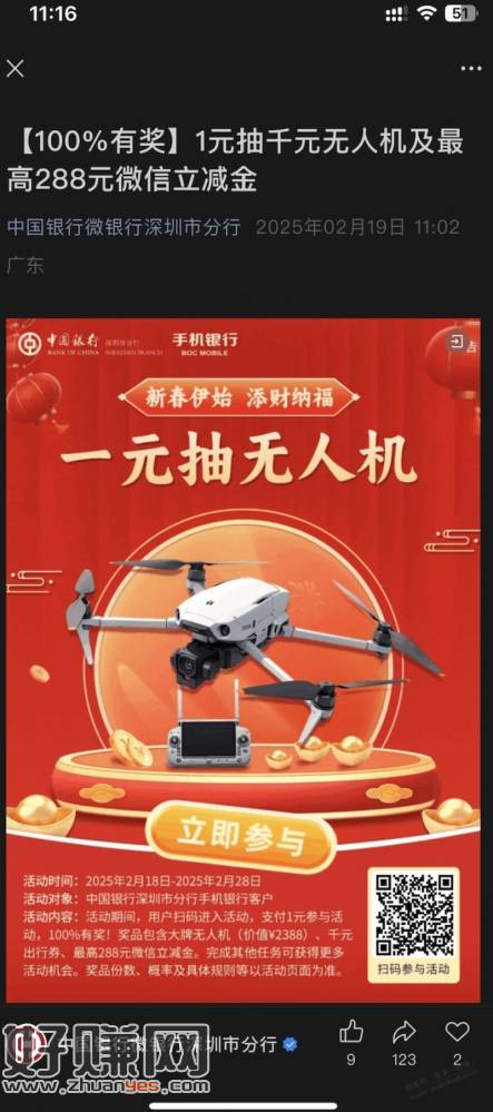 深圳中行公众号新发的活动,付1块必中微信立减金