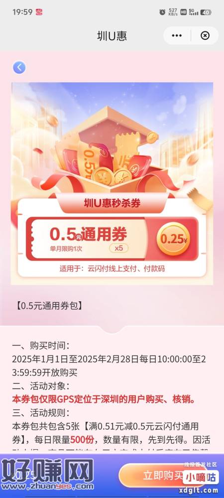 深圳 云闪付0.25买0.5通用卷×5,点外卖能用