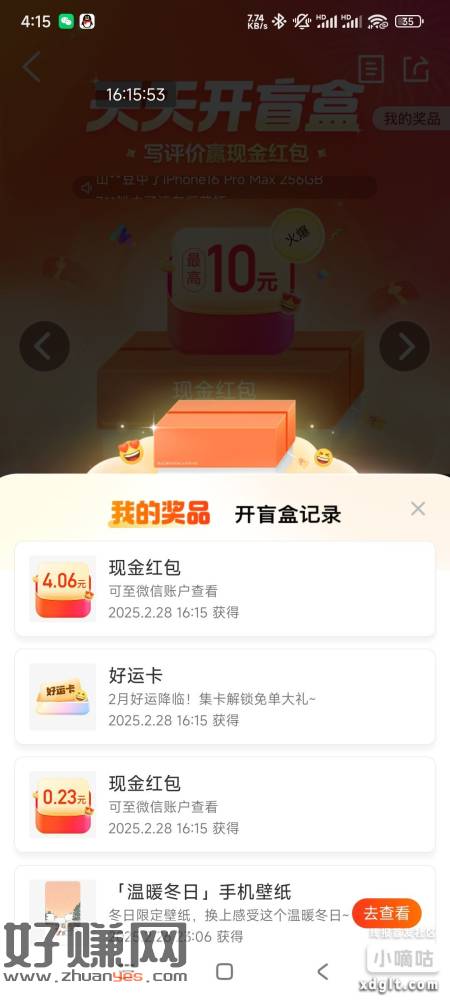 大众点评搜天天开盲盒,随便去店铺点评一下,好评卡可以抽奖