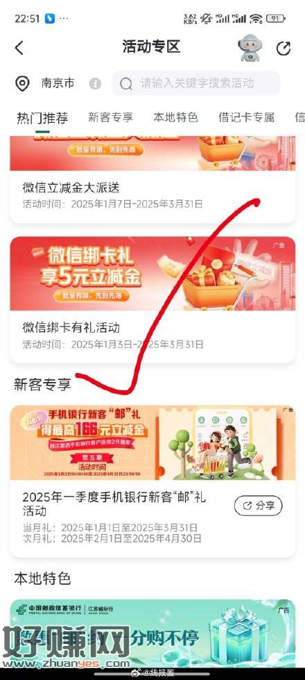 邮储app,我的,活动专区,热门推荐,下滑,5立减