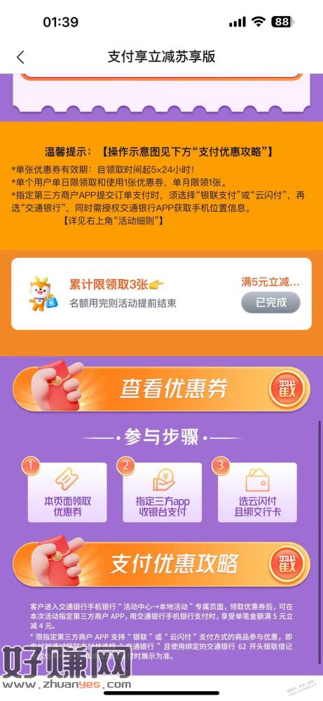 交通银行app搜支付享立减-江苏,领5-4