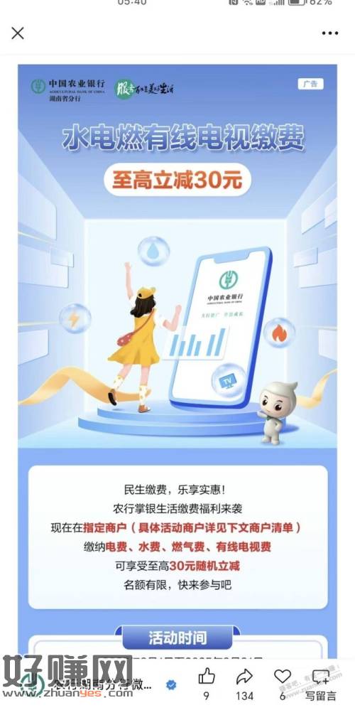 湖南农行生活缴费满30最低减5