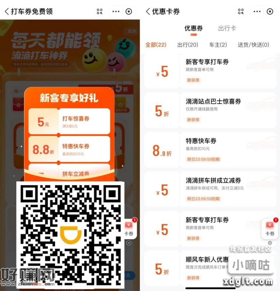 【支付宝部分人领滴滴9减5亓券】支付宝APP扫码->部分人弹9减5亓打车券,换不常用的号看看 应该都有