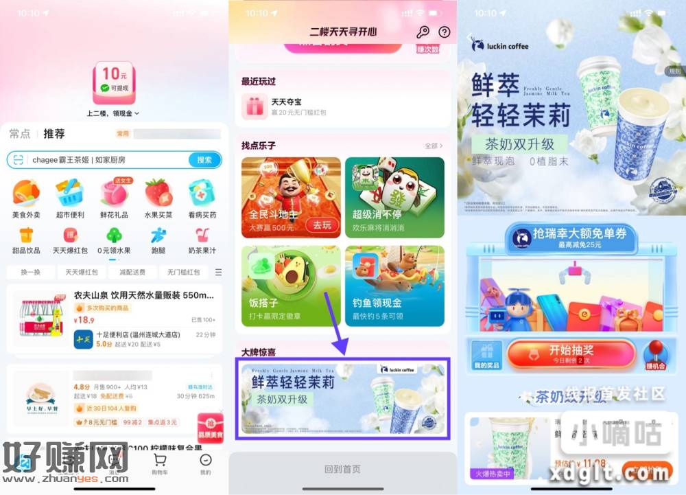 【饿了么抽瑞幸咖啡25亓免单券】饿了么顶部下拉进入二楼->下拉点横幅进入->有2次机会抽瑞幸25亓券